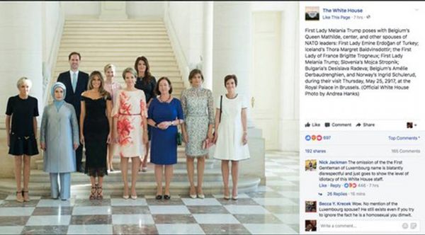 geçen hafta belçika’da gerçekleşen nato zirvesi’nde dünya liderlerinin eşlerinin çekilen aile fotoğrafının açıklamasını eksik paylaşan beyazsaray ekibi abd’de büyük bir tartışma başlattı. beyaz saray’ın resmi facebook hesabında paylaşılan bir fotoğraf büyük bir tartışma yarattı. geçen hafta br..